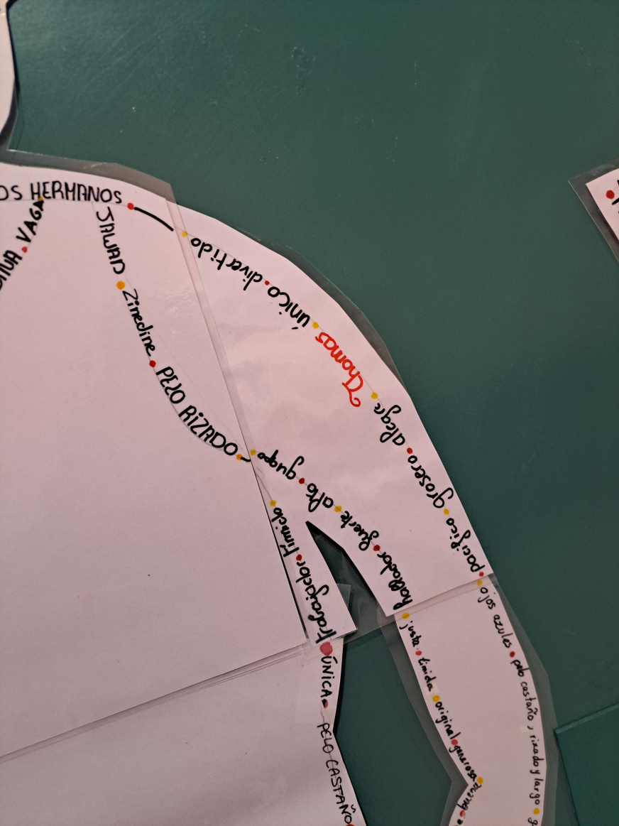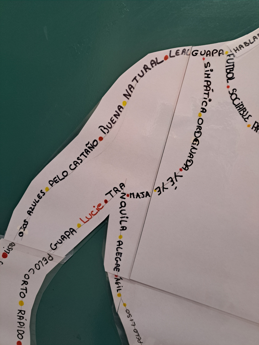 Cada uno ha hecho una parte con su nombre y adjectivos que nos describen.