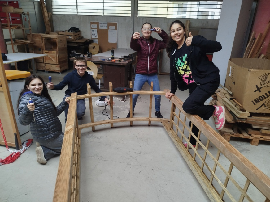 Ces élèves ont monté une arche en bois qui servira de tuteur aux plans de kiwi qu’ils planteront dès la rentrée dans le jardin.