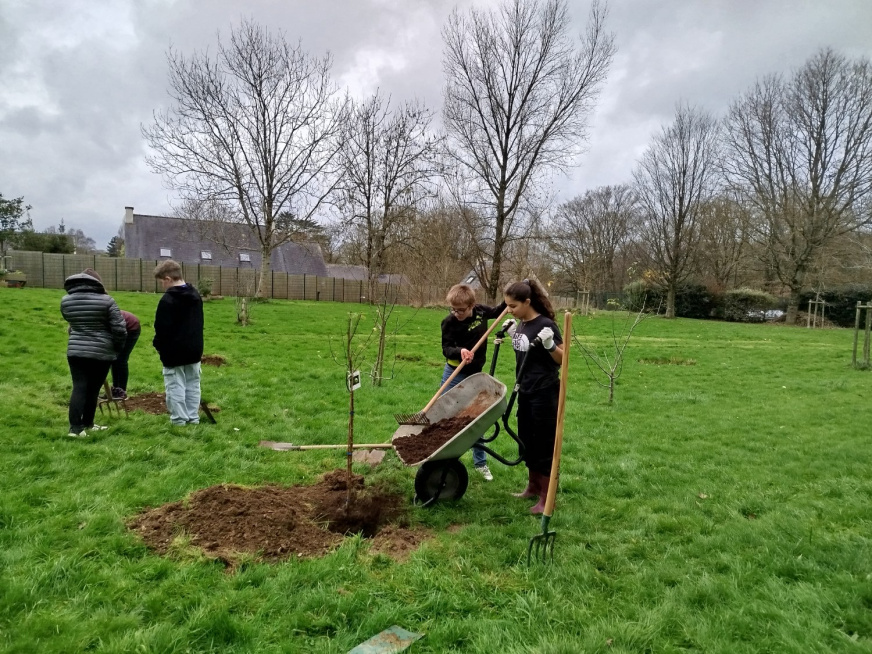 Les élèves participant à l’atelier Développement Durable ont planté 4 arbres fruitiers dans la parcelle située entre l’administration et le collège. Ils ont été retardés dans cette plantation du fait d’un temps exécrable. Ce verger prend forme puisqu’il est constitué désormais de 7 arbres fruitiers et bientôt un 8e. Une zone sera délimitée dans cette parcelle afin de faire une tonte raisonnée.