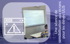 Dans le cadre de leur dernière année de formation, trois étudiants de 3e année se préparant au DTSIMRT (Diplôme de Technicien Supérieur, Imagerie Médicale et Radiologique Thérapeutique) ont fait une séance d’information sur l’utilisation des écrans auprès des élèves du dispositif ULIS le jeudi 4 décembre.Les étudiants ont interrogé les élèves sur leurs pratiques et les rapports qu’ils ont avec les écrans.